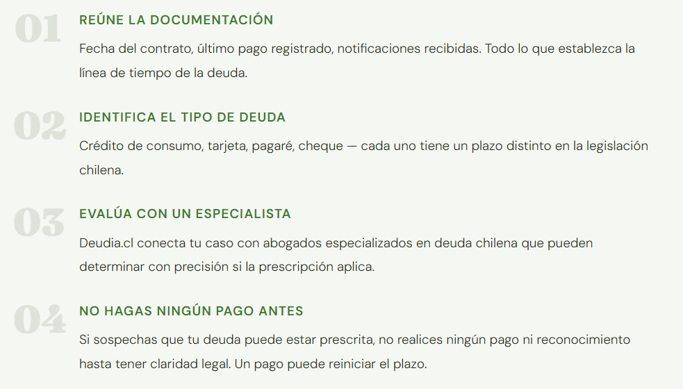 Por eso, antes de hacer cualquier pago o acuerdo sobre una deuda antigua, es crítico evaluar si ya prescribió. Pagar una deuda prescrita no solo es innecesario legalmente: puede extender indefinidamente una obligación que el tiempo ya había extinguido.