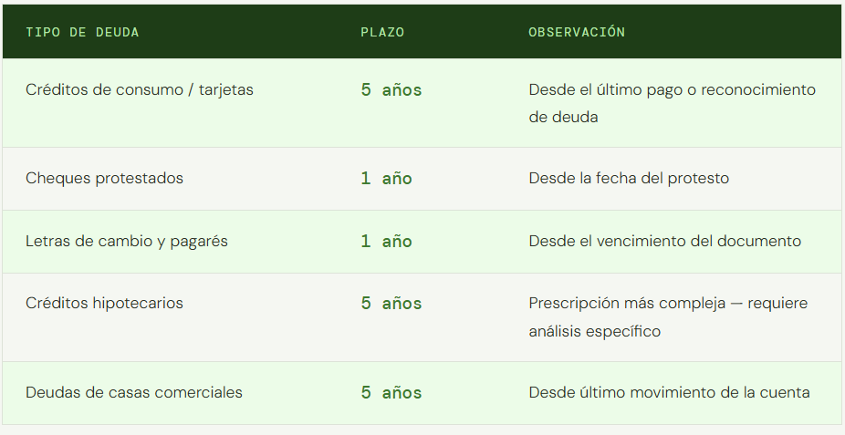 La legislación chilena establece plazos distintos según el tipo de deuda. Estos son los más relevantes para personas naturales: